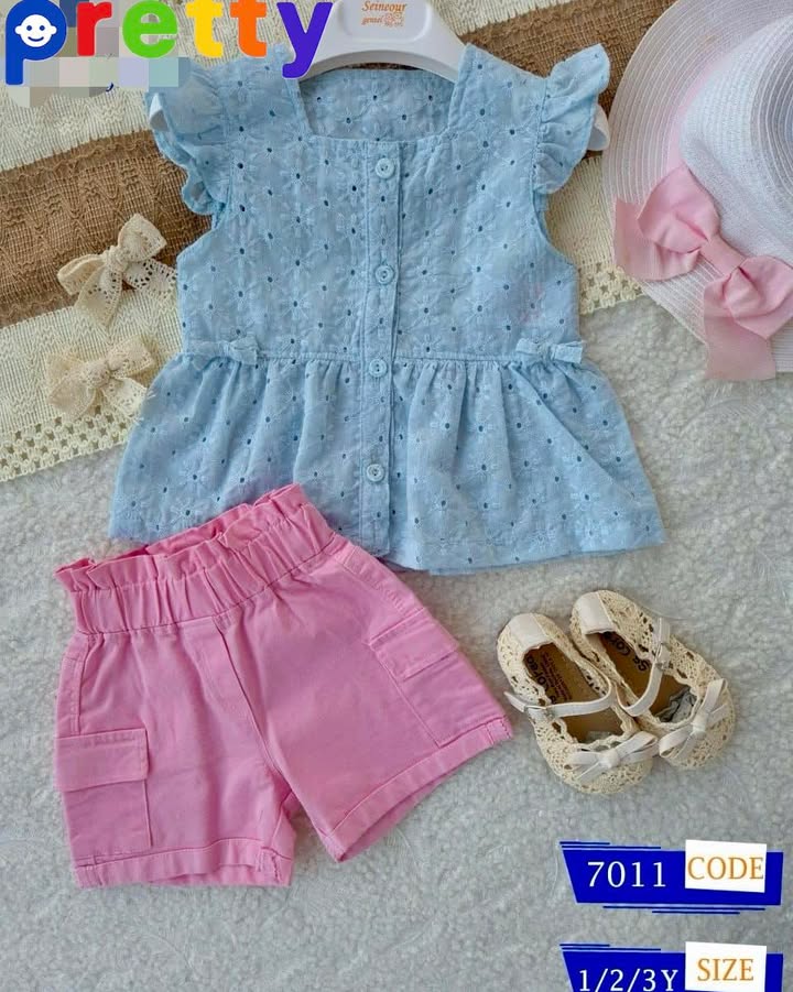 طقم بناتي قطعتين بلوزة كرانيش وفيونكات +شورت جبردين